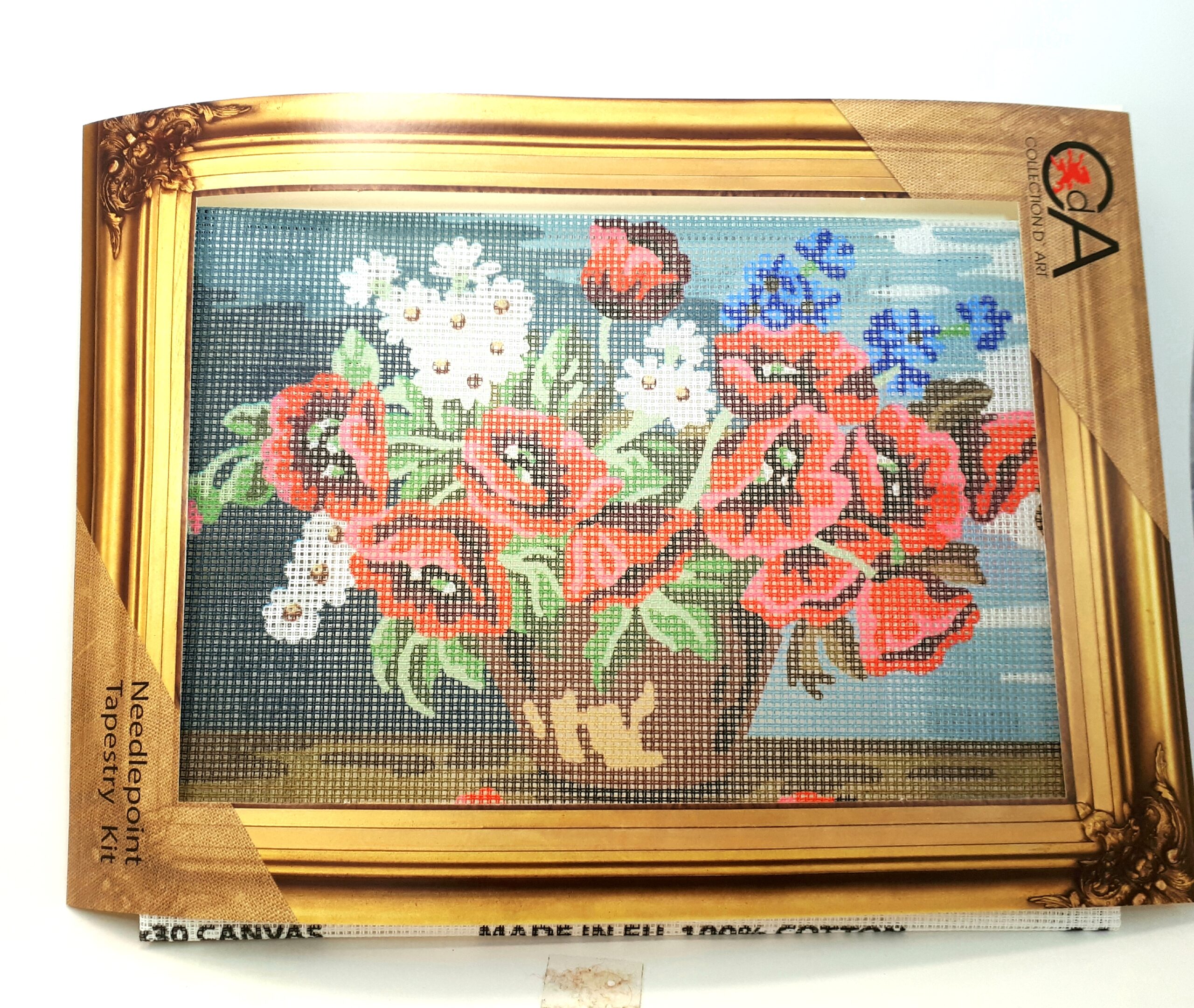 Pakkaus sisältää: puuvillakankaan.  puuvillalangat. neulan. Valmiin työn koko on 22 x 30 cm