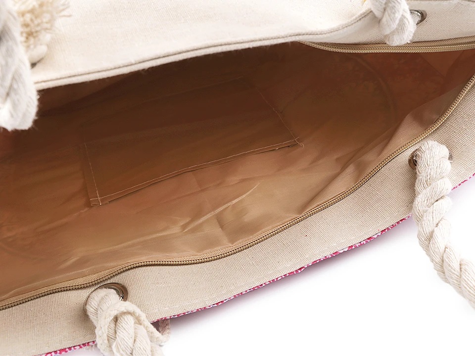Kaunis ja tilava kassi. Mukana on myös samalla kuviolla oleva pikkupussukka. Kuvio toisella puolella ja toinen puoli on pellavan värinen. Vetoketu ja sivutaskullinen vuorikangas sisällä.