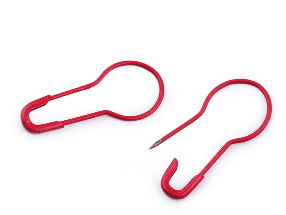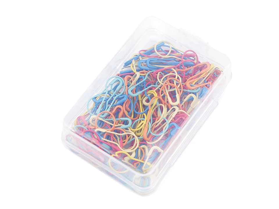 Rasiassa metallisia, värikkäitä, hakaneulamaisia silmukkamerkkejä n. 150 kpl. Pituus 22 mm.  Sopii monenlaiseen kiinnittämiseen, neulan vahvuus n- 0,7 mm