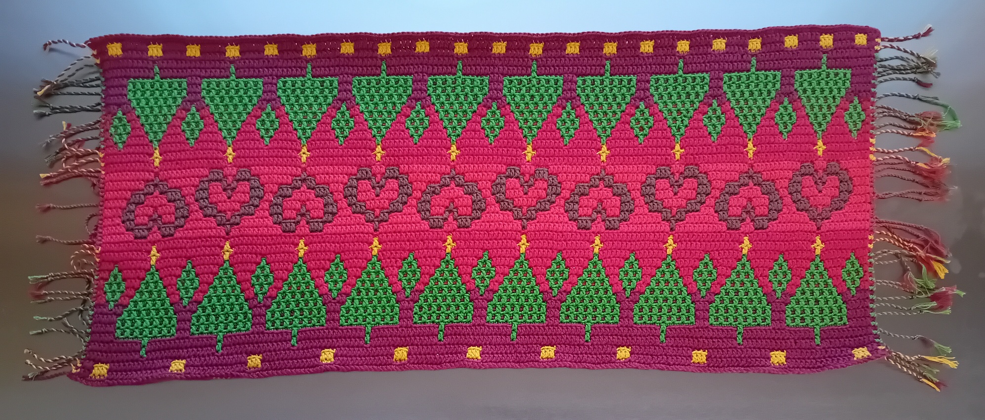 Kokeile hauskaa mosaiikkivirkkausta! Tässä ohje Jouluiseen liinaan, jonka koko on n. 30 x 65 cm, mutta se on myös helposti muunneltavissa eri pituuksiin. Lankana on käytetty DMC Natura just cotton puuvillalankaa, jota on helppo virkata. Voit ostaa pelkän ladattavan ohjeen 6,- ja/tai langat siihen 24,- . Jos tarvitset lisäkeriä, niin valitse ne lankavalikoista, lisäkerät Viininpun. 34, kirkas pun.555 ja vihreä 48. Ohje on ladattavissa 30 vrk ajan, joten kannattaa tallettaa se omalle koneelle heti.