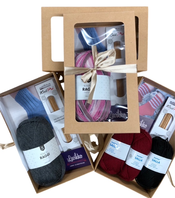 Paketti sisältää sukka ohjeen, langat ja puikot. Paketeissa on joko 3 tai 3,5 mm:n puikolla neulottava laadukas sukkalanka.