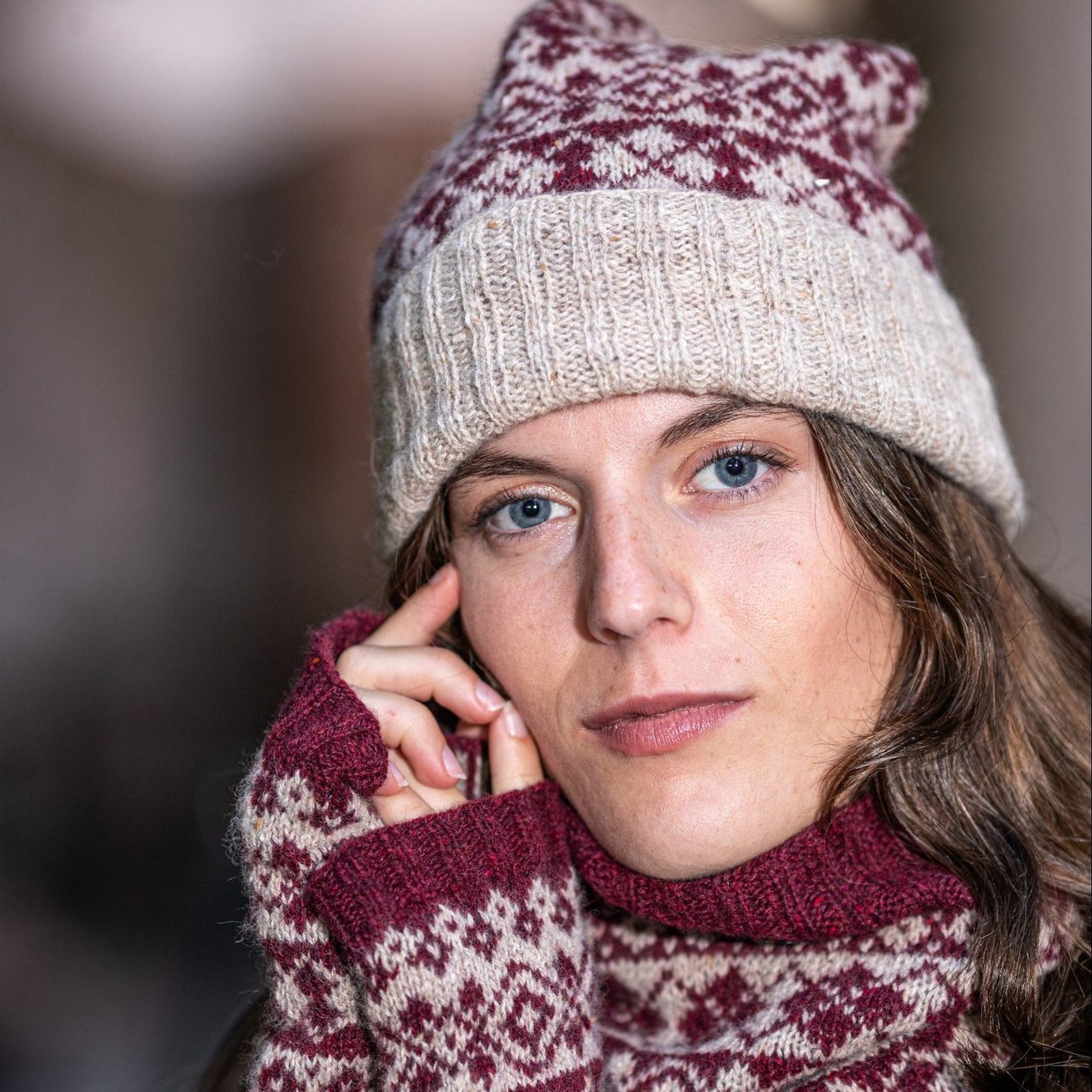 Cometa asustesettiin 4 kerää, kaksi kumpaakin väriä. Pipo, kämmekkäät ja tuubihuivi. Pyydä ohje langan mukaan.